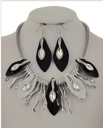 Black and white leaf statement necklace set with rhinestone and silver accent.