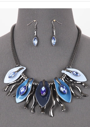 Blue leaf necklace statement necklace set with rhinestone accent and hematite chain.
