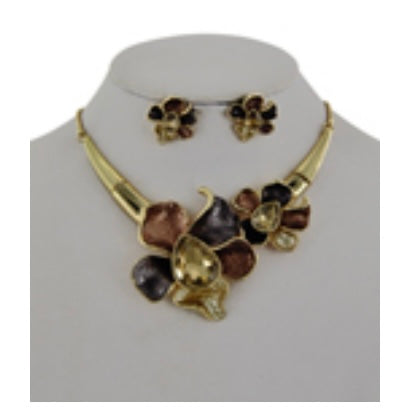 Brown and gold cluster flower necklace set with rhinestone accent.