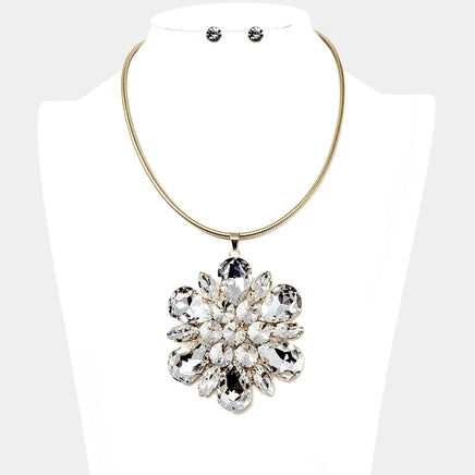 Gold Cluster Stone Necklace Set with Flower Pendant