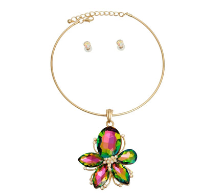 Gold Metal Rigid Collar Necklace Set Featuring Mixed Pink and Green Crystal Rhinestone Flower Pendant./ Vitrail