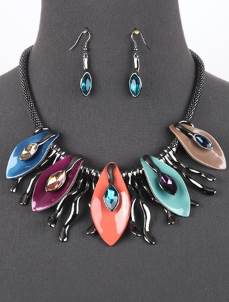 Multi-color leaf necklace statement necklace set with rhinestone accent and hematite chain.