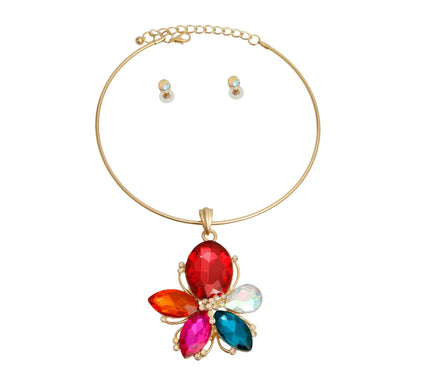 Gold Metal Rigid Collar Necklace Set Featuring Multi Color Crystal Rhinestone Flower Pendant.
