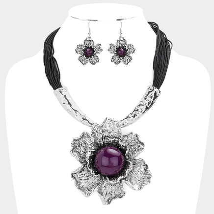 Acrylic purple necklace set with leatherette cord and antique silver accent.