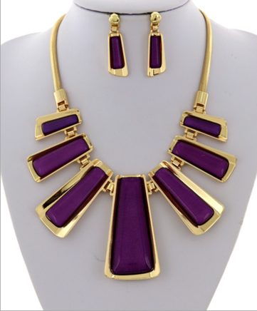 Purple and gold acrylic bar statement necklace set with drop earrings.