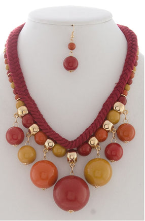 Red and yellow braided necklace set with large, dangle, beaded charms and gold accent.