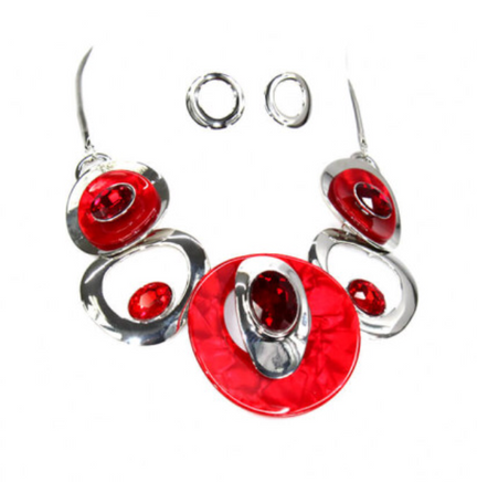 Red and silver acrylic circle linked statement necklace set with marble design and rhinestone accent.