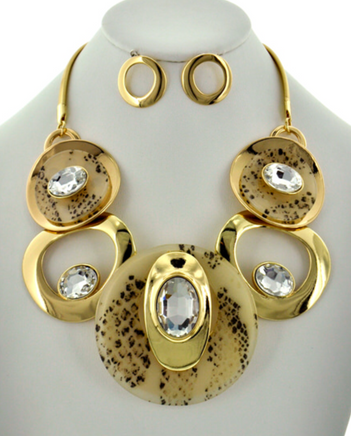 Snake and gold acrylic circle linked statement necklace set with marble design and rhinestone accent.