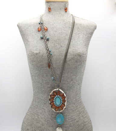 Long statement tassel necklace with turquoise and brown pendant.