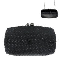 BLACK RHINESTONE EVENING BOX CLUTCH PURSE WITH DETACHABLE METAL CHAIN STRAP AND GOLD HARDWARE