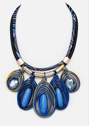 - Blue and gold dangle pendant necklace with leatherette cord