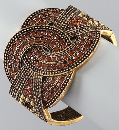 - Brown and antique gold hinged bracelet with rhinestone accent