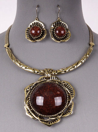 Brown and antique gold necklace set with chunky flower pendant.