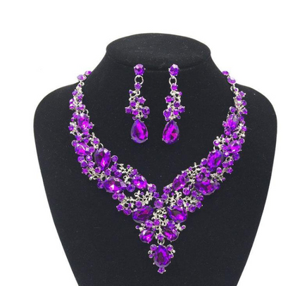 Purple and Silver Rhinestone Formal Drop Necklace Set