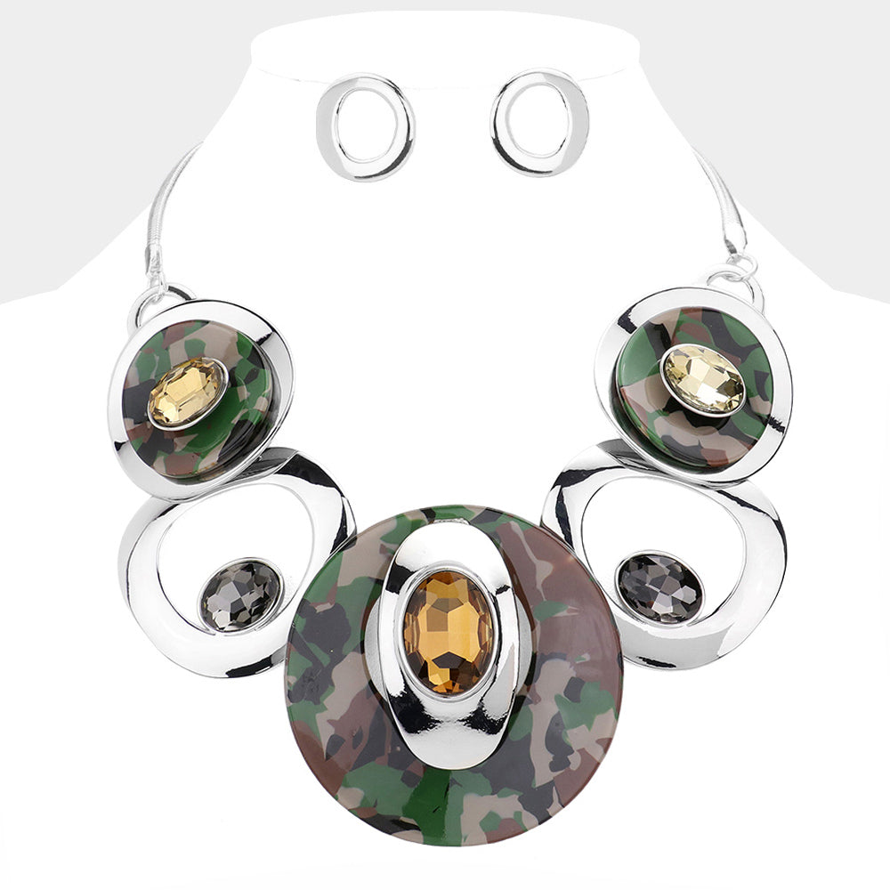 Silver Camo Stone Open Pendant Necklace Set